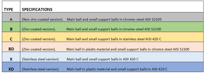 Felt seal: starting from the size “22” all these ball transfer units are provided with oiled felt seal to reduce the possible introduction of impurities, dirt and chips. The versions “BD” and “XD” are provided without felt seal. On request, all ball transfer units can be supplied without felt seal or with dry felt seal.